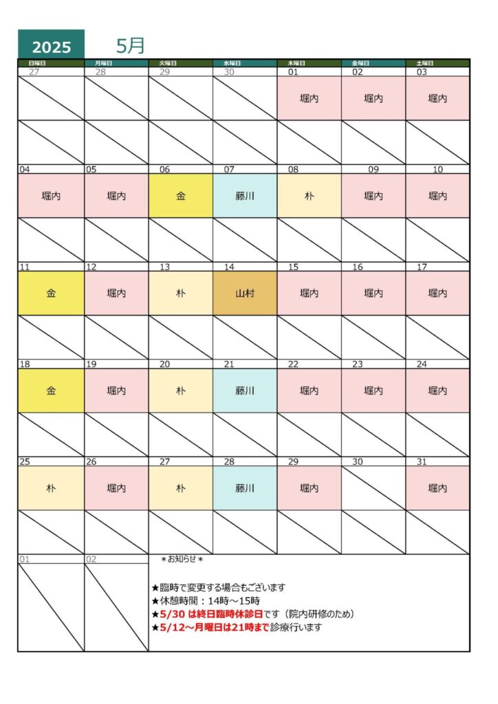 5月 診察医師カレンダー