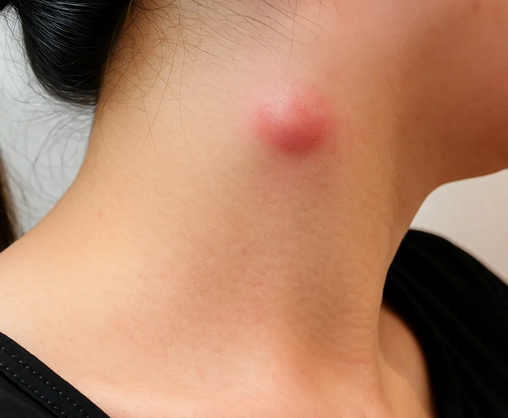 粉瘤は皮膚の下部にできる良性の腫瘤で、皮脂や角質などの老廃物が袋状の組織内に蓄積することで生成されます。初期では小さな隆起として現れますが、時間の経過とともに徐々に拡大することがあります。細菌感染を起こすと赤く腫れ上がり、痛みを伴うことがあります。 治療は基本的に外科的除去となります。局所麻酔下で小切開を実施し、袋状の組織ごと完全に摘出することで再発を防ぎます。感染を起こしている場合は、まず抗菌薬による治療を実施し、炎症が改善してから摘出手術を行います。放置すると拡大したり感染を繰り返したりする可能性があるため、早期の受診をお勧めします。